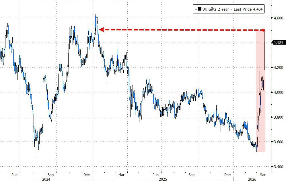 周四当日2年期英债收益率涨超30个基点,自美伊冲突开始以来已累涨近100个基点。